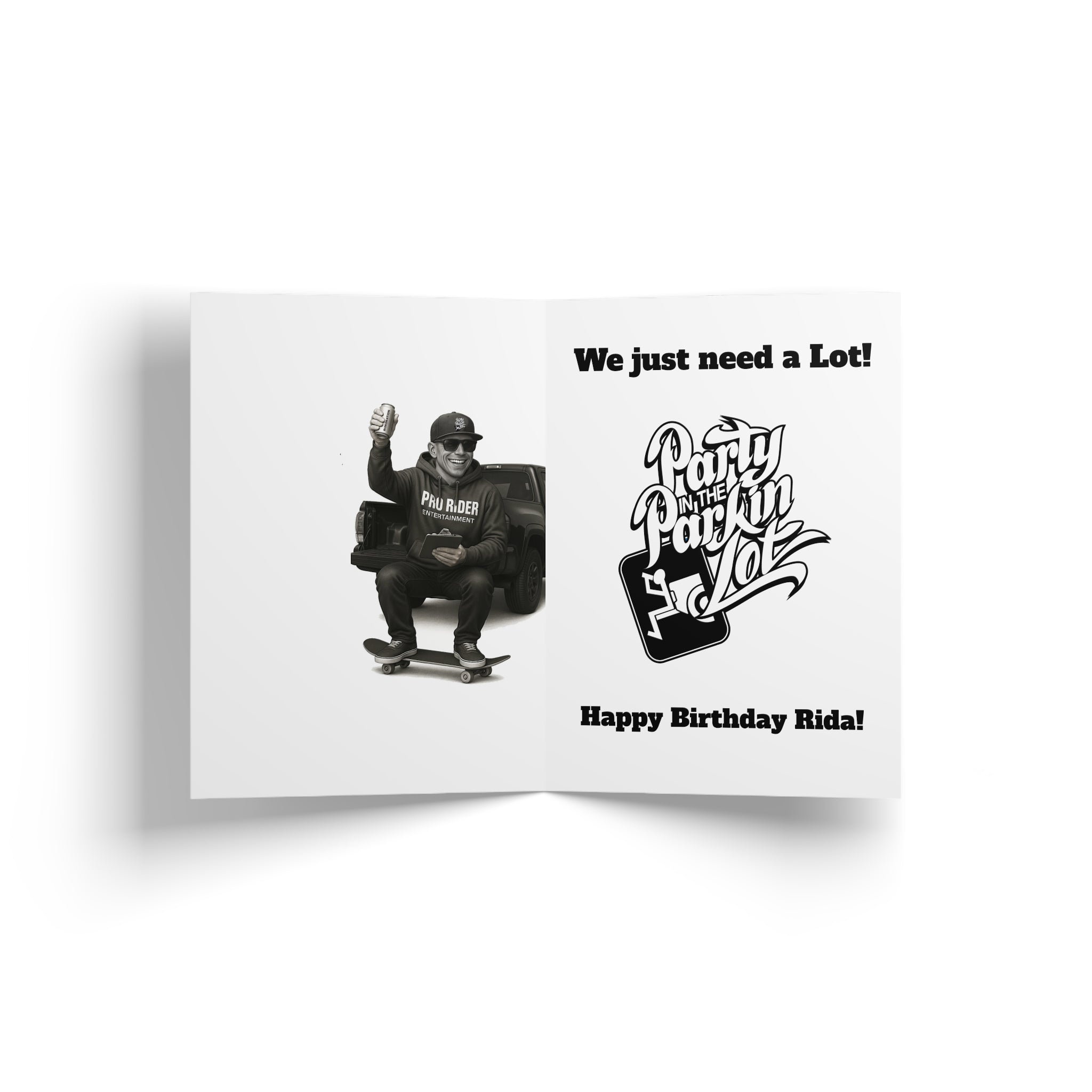 The Party In The Parkin Lot Birthday Card delivers humor that makes birthdays unforgettable. Printed on premium white paper with envelope included. Finished with Party In The Parkin Lot detailing. Ridaz Gotta Laugh!