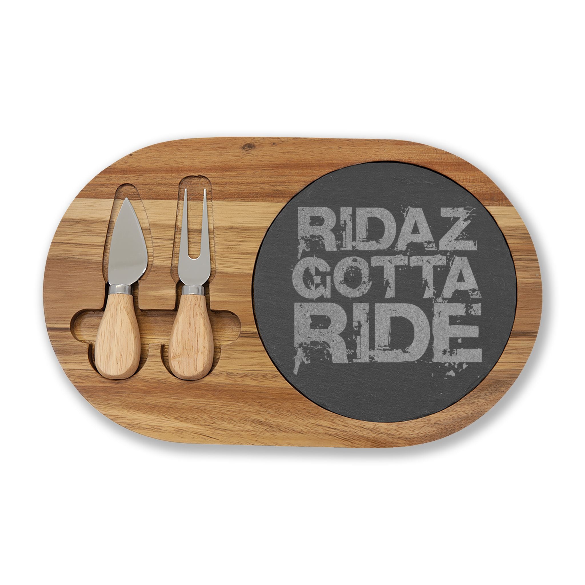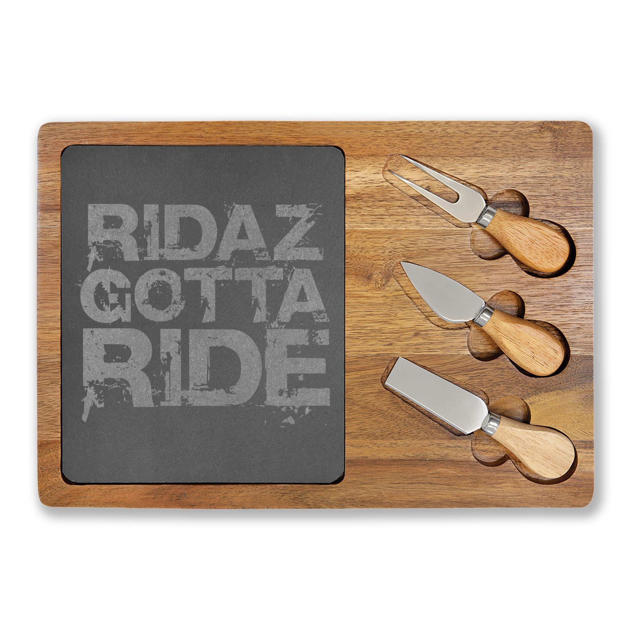 The Ridaz Gotta Ride Charcuterie Board is designed for serving and presentation with a refined, natural finish. Crafted from solid acacia wood with an engraved slate center, it offers a durable base for shared spreads and entertaining. Finished with Ridaz Gotta Ride detailing for a bold, modern look. Ridaz Gotta Eat!